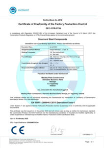 CE Marking – MACKEY is certified to the highest level possible, Execution Class 4, including Design Methods 1; 2; 3a & 3b, which very few IRISH Contractors have achieved. The ‘CE’ certification demonstrates that MACKEY have the requisite Factory Production Control system in place and fully operational. This verifies compliance with the detailed requirements of BS EN 1090-1:2009+A1:2011, BS EN 1090:2-2008 and EN ISO 3834:2 & 3-2005.